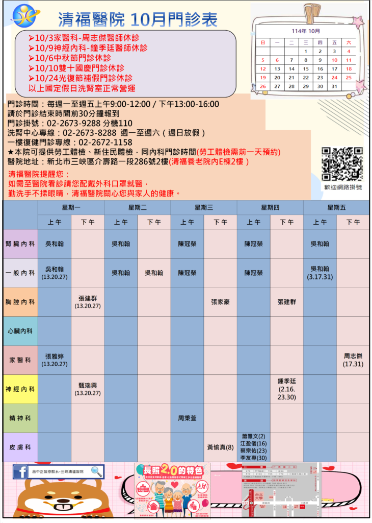 腎臟內科、一般內科、胸腔內科、心臟內科、家庭醫學科、神經內科、神經外科、精神科、皮膚科、肝膽腸胃科、骨科